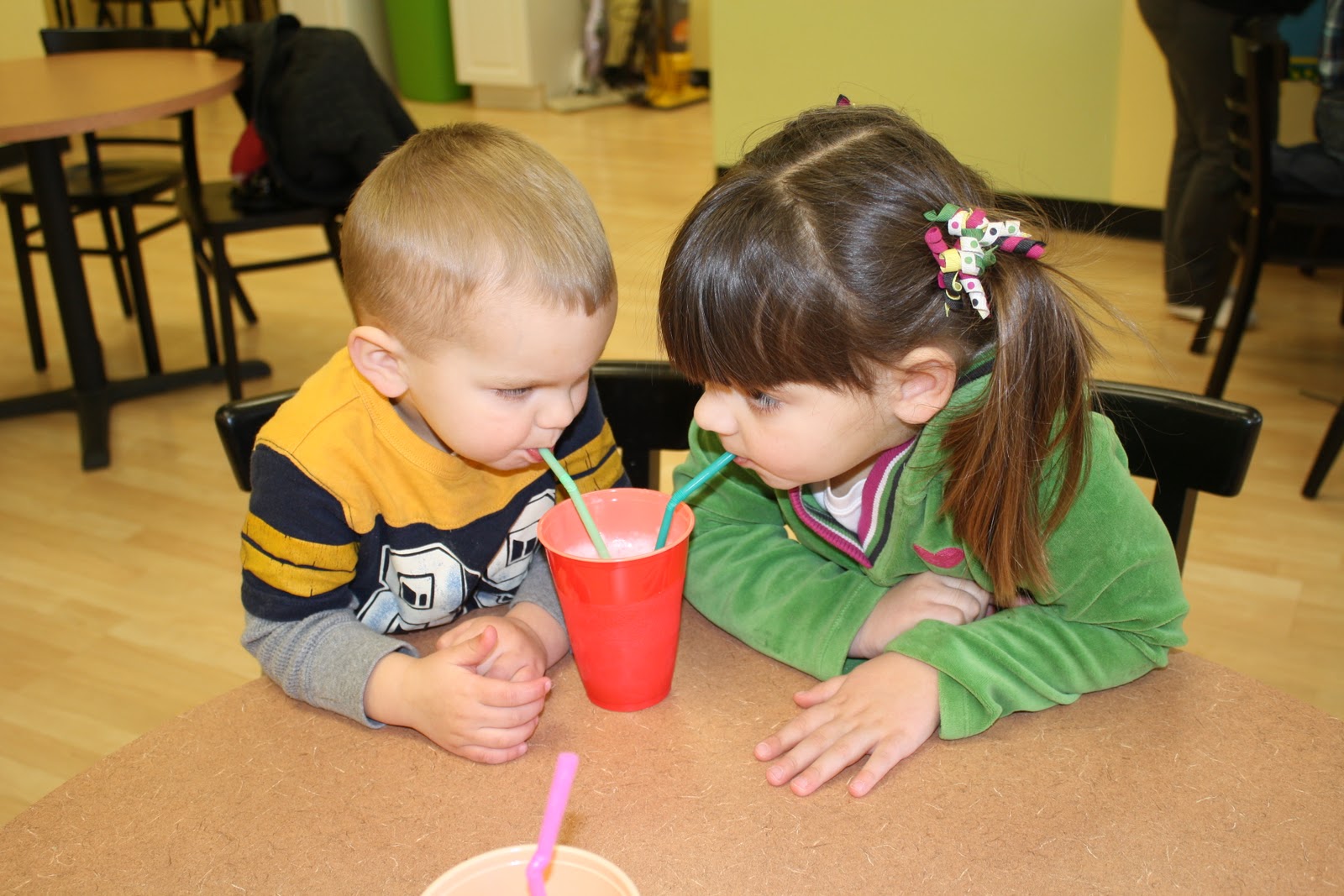 | This is my idea of a "day in the sun;" Josie and Jamie sharing a strawberry smoothie. |